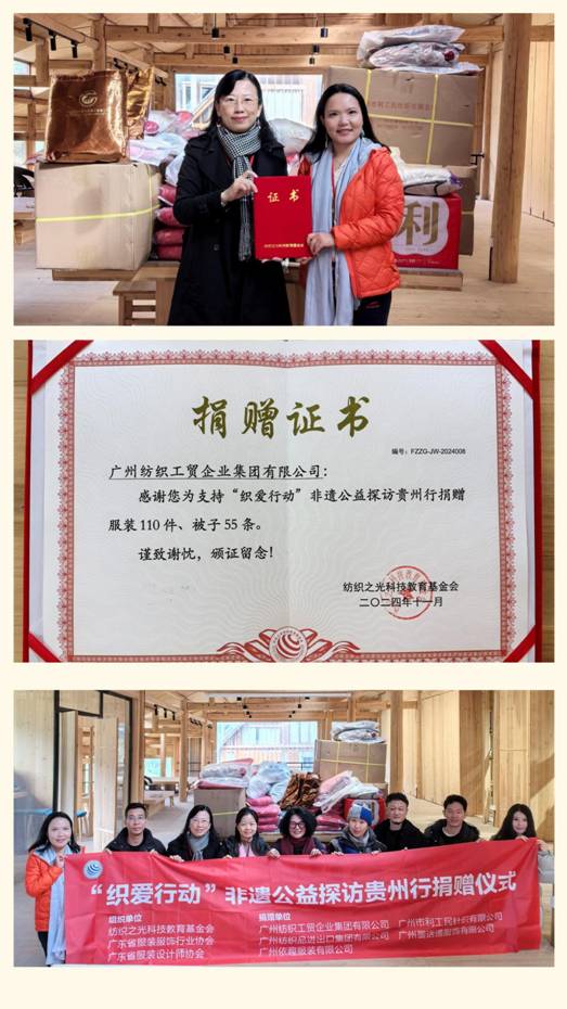 近日,紡織公司黨委副書記丘海瀾一行參加了由紡織之光科技教育基金會、中國婦女發(fā)展基金會主辦,中國服裝協(xié)會、中國紡織工業(yè)企業(yè)管理協(xié)會、廣東省服裝服飾行業(yè)協(xié)會、廣東省服裝設計師協(xié)會協(xié)辦的“織愛行動”非遺公益探訪貴州行活動。今年,紡織公司旗下“利工民汗衫背心制作技藝”成功入選廣州市荔灣區(qū)第八批非物質(zhì)文化遺產(chǎn)代表性項目名錄。此次活動希望通過對非遺手工藝進行深入調(diào)研,探討融合發(fā)展道路,同時向困境婦女及家庭傳遞溫暖。一方面通過捐款、捐贈紡織服裝物資進行直接幫扶;另一方面通過賦能傳統(tǒng)手工技藝,引導紡織服裝行業(yè)品牌企業(yè)、設計師與傳統(tǒng)手工技藝融合共益共生發(fā)展,讓傳統(tǒng)手工技藝從“指尖技藝”轉(zhuǎn)變?yōu)椤爸讣饨?jīng)濟”,推進就業(yè)創(chuàng)業(yè)、助力困境女性可持續(xù)發(fā)展,體現(xiàn)了企業(yè)的社會責任感和文化傳承的使命。